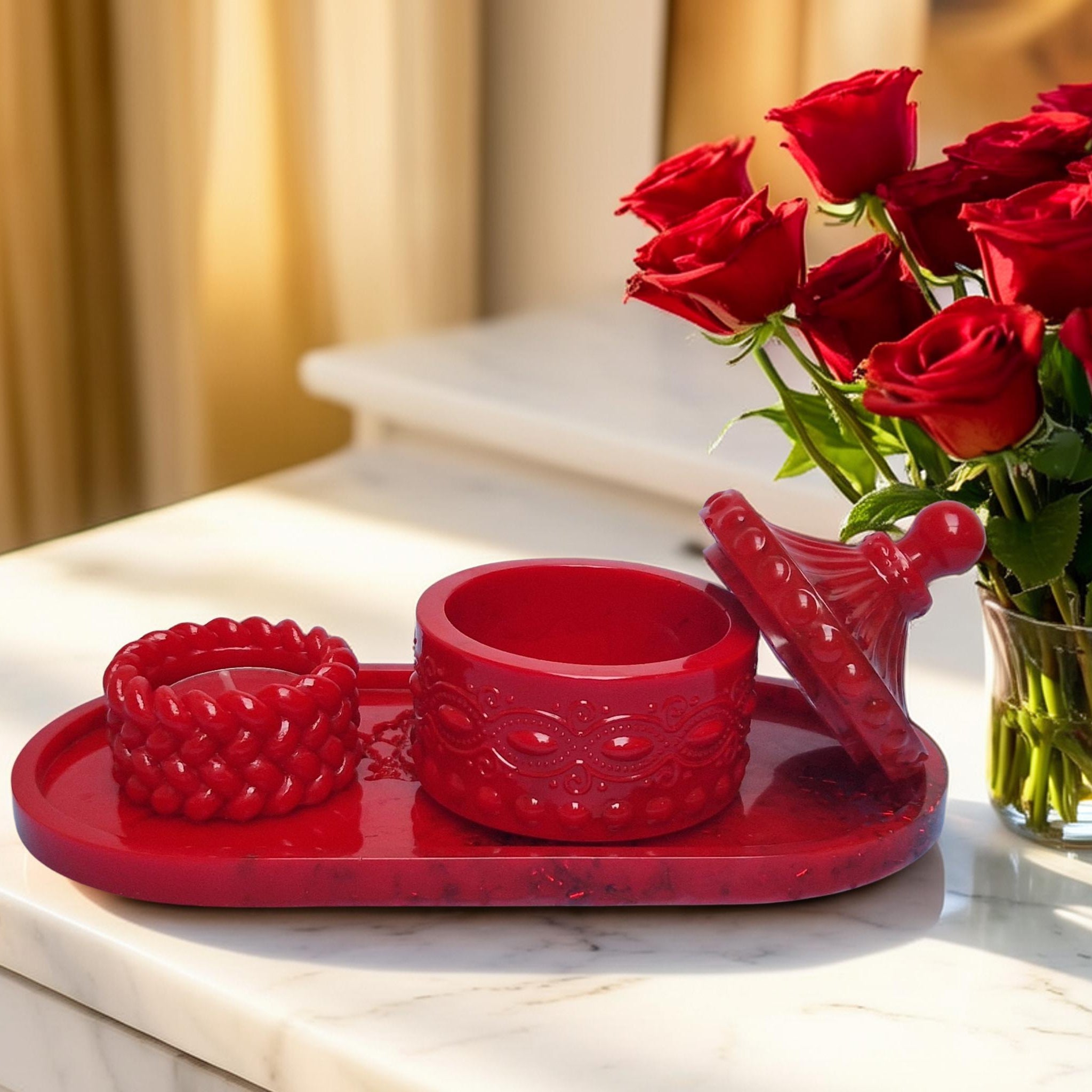 Conjunto Romântico em Resina – Escultura Casal & Castiçal Vermelho